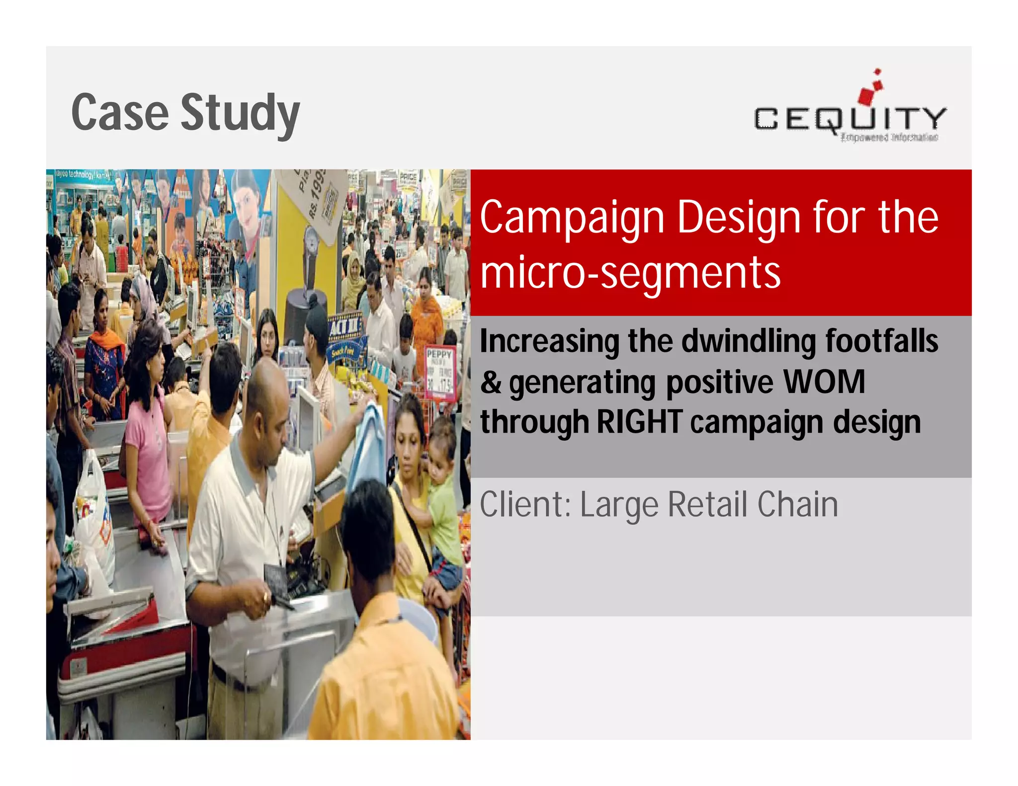 The case study outlines a campaign designed for a large retail chain aiming to increase customer footfalls and reduce churn rates by analyzing customer behavior through micro-segments. Using the RFM methodology, targeted promotions were crafted for different clusters, resulting in significant revenue increases and a high ROI from campaigns. The initiative successfully reversed declining customer engagement and provided insights on performance tracking and sales distribution.