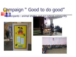Students at a school participated in a campaign called "Good to do good" to help an animal shelter by sewing mats and collecting food for cats and dogs. Some students and teachers then brought the donated mats and food to the shelter. The school community also helped care for a homeless cat found near the school that has now been adopted. An exhibition was held to showcase the students' work for the campaign, and they plan to continue working on animal-related projects, such as educating pet owners on proper care.