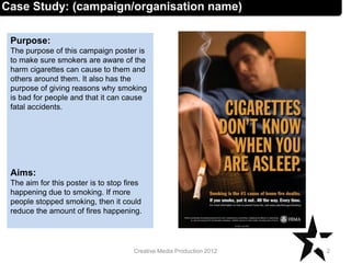This document contains analyses of three campaign posters. The first aims to warn people about the dangers of smoking and fires. It uses bold capitalized text and an image of a man asleep with a cigarette. The second aims to stop animal cruelty by showing contrasting images of a fragile dog and boxing gloves to say animals cannot protect themselves. The third encourages donations for impoverished children by featuring a photo of a child making eye contact and bold text highlighting words like "you" and "childrens lives".