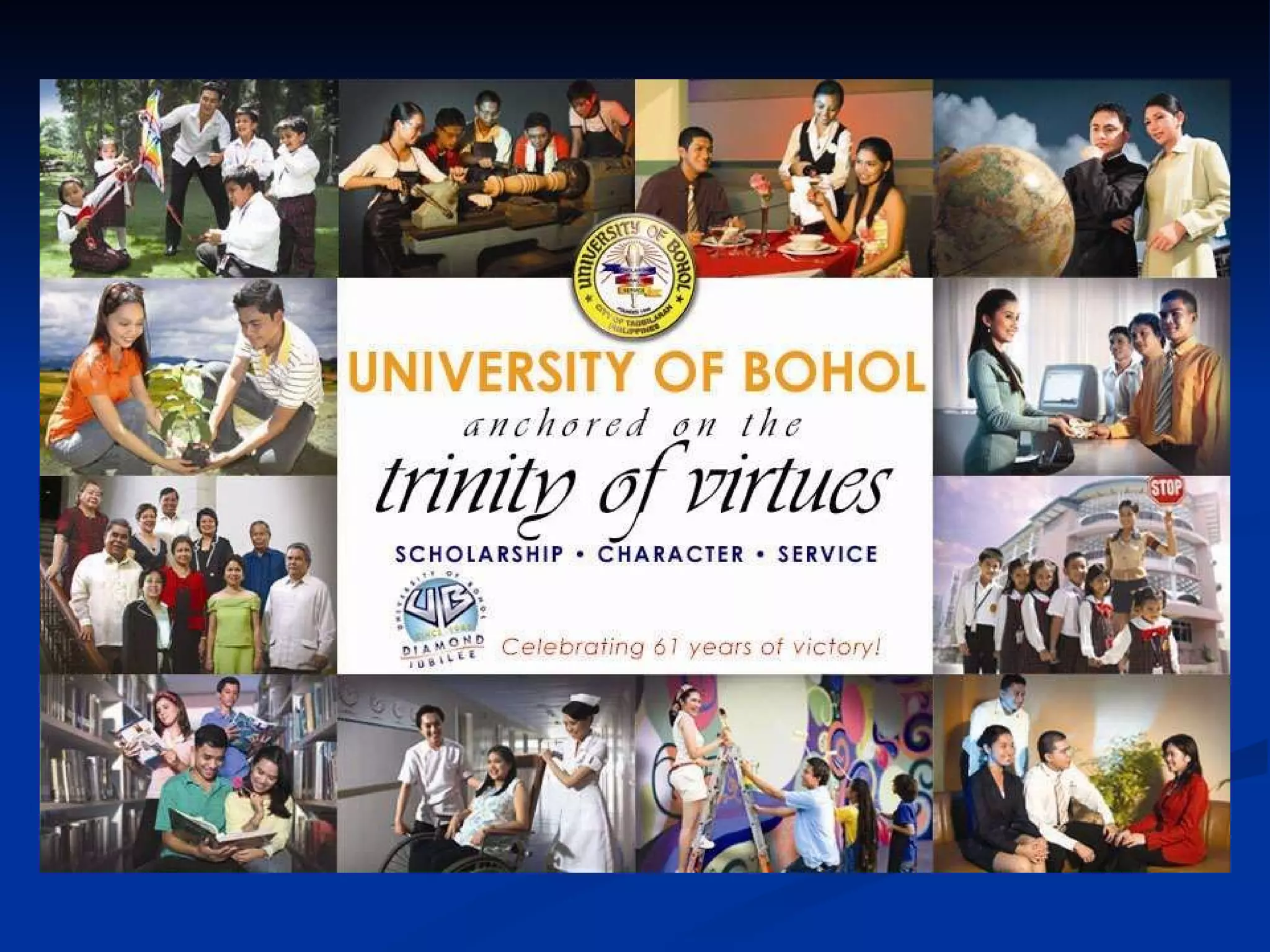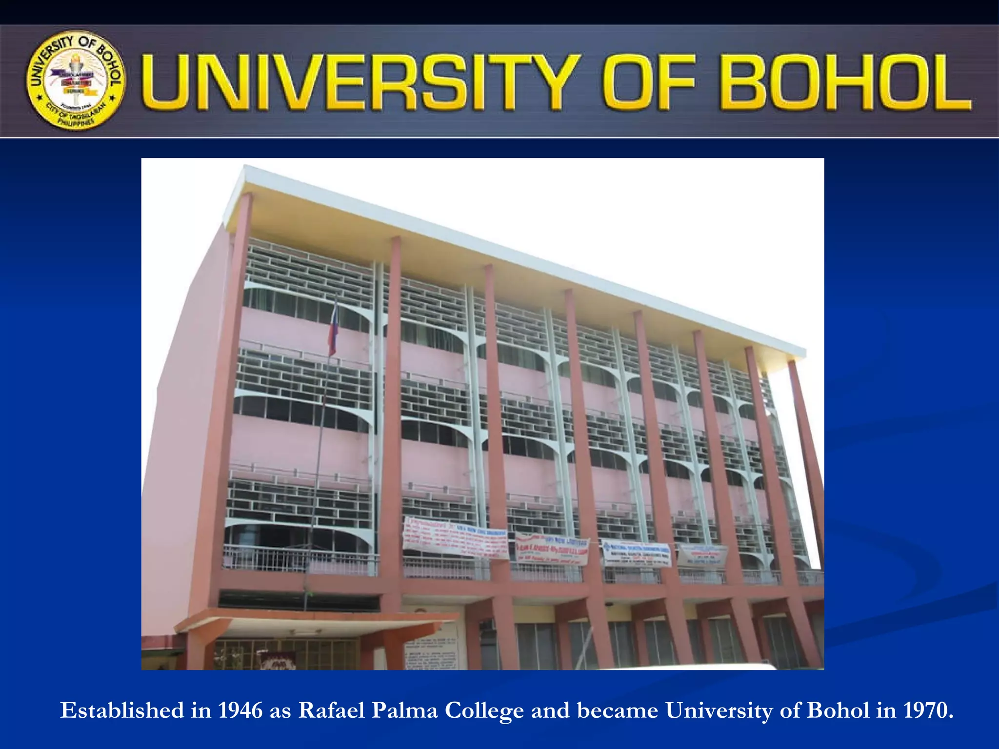 The University of Bohol was established in 1946 as Rafael Palma College and became a university in 1970. Its vision is to enable students to live worthy, fulfilling, and abundant lives through holistic education focused on scholarship, character, and service. The university aims to develop self-reliant students with relevant skills and knowledge who are committed to serving God, country, and community. It has a long history of "firsts" on Bohol as the pioneering institution of higher learning and has consistently produced top-performing graduates.