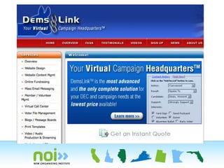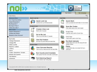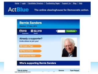 This document discusses technology tools that can be used in political campaigns to manage data, make decisions, and organize work. It recommends using VAN for voter files and volunteer management, Salsa for websites, email, and online forms, and ActBlue for online fundraising. It also suggests designating one staff member to be responsible for overseeing all campaign technology and ensuring tools are integrated across departments.