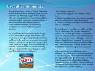 Skippy Peanut Butter aims to revitalize its advertising campaign by targeting children ages 5-11. Its new circus-themed campaign will feature characters like Chunky the Elephant to build awareness and interest using TV, print, outdoor and online advertising. This will turn Skippy into a fun snack for children and create lifelong brand loyalty as they influence parents' purchasing decisions.