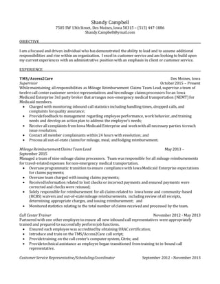 Shandy Campbell is an experienced customer service professional seeking an administrative position with an emphasis on customer service. She has over 5 years of experience at TMS/Access2Care in Des Moines, Iowa in roles of increasing responsibility including her current role as Supervisor where she oversees 22 employees. She has a proven track record of strong leadership, problem solving, and ensuring high quality customer service.