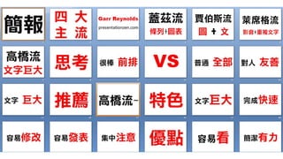 Gates 特色 1. 巨大文字 2. 鮮艷字體 3. 製作速度快 4. 簡短語句 5. 投影片量多 1. 生動演說 2. 畫面簡潔 3. 文字少 4. 簡報停留時間短 1. 一小段引述 2. 一張圖片 3. 簡報停留時間短 4. 說書人方式 1. 標題明確 2. 圖表大量運用 3. 大量條列與圖表 4. 座標軸線清晰 結果 集中聽眾目光 印象深刻 印象深刻 明確了解 場合 時間短、 強調概念的演說 商業簡報、產品發表 說明理念、 鼓舞人心的演說 商業簡報、 產品發表、公司介紹