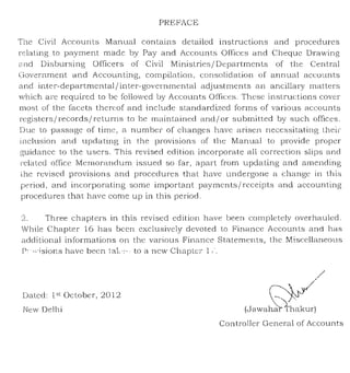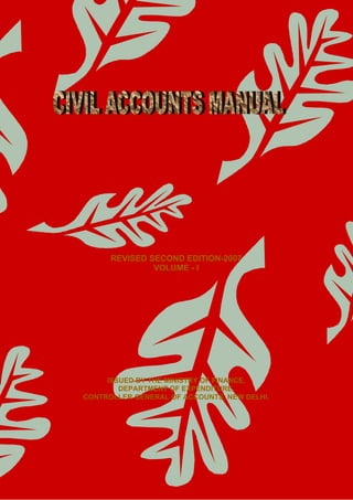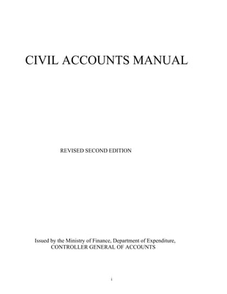 This document provides guidelines for the departmentalized accounting system used by the Ministry of Finance in India. It summarizes the roles and responsibilities of the Controller General of Accounts and Central Accounts Offices in managing payments, receipts, accounting records, and preparing consolidated financial statements. Procedures are outlined for activities like pre-checking bills, pension processing, inter-governmental transactions, and compiling appropriation accounts. The document aims to establish standardized practices across the departmentalized accounting system in India.