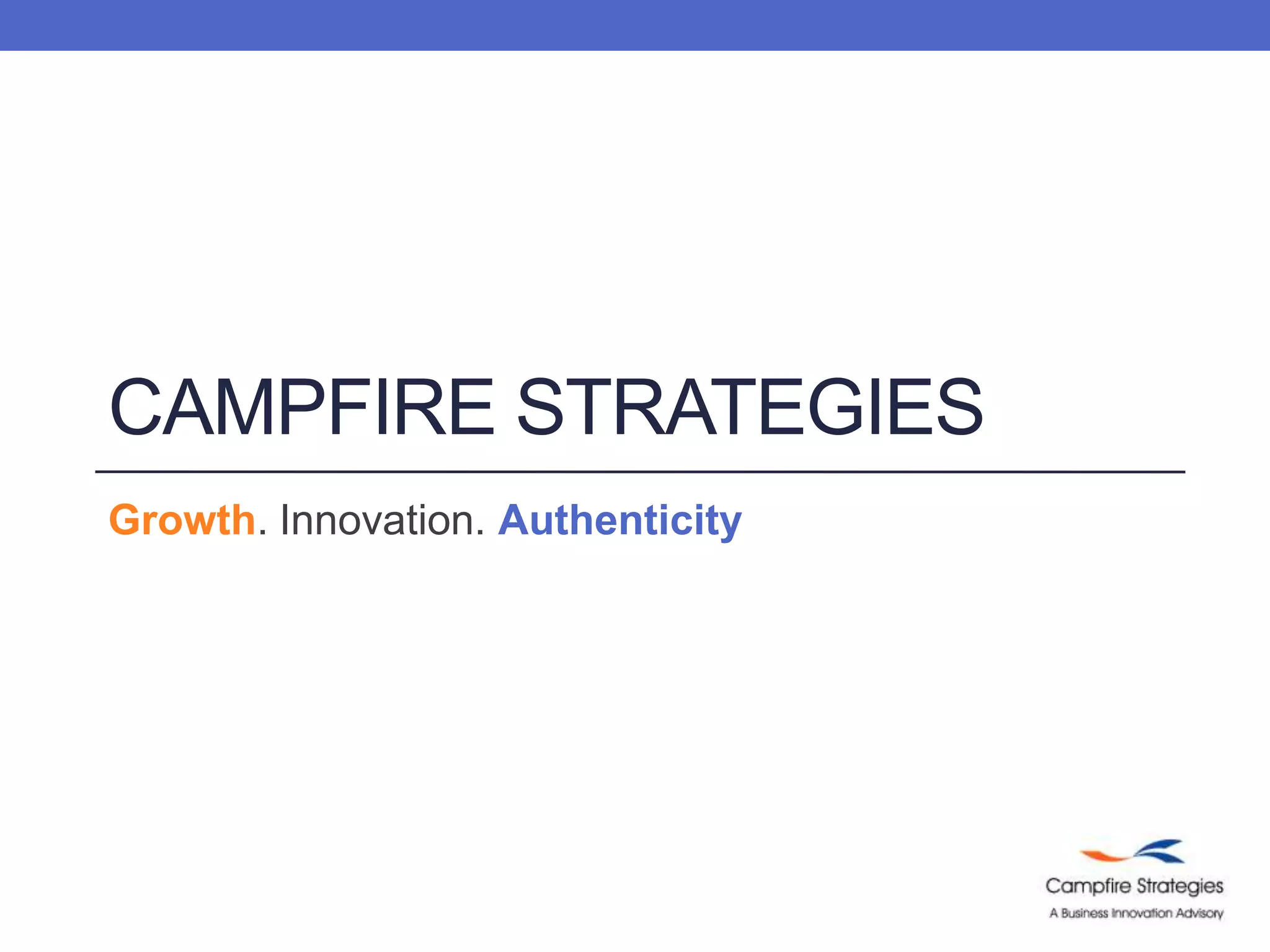 Campfire Strategies is a business innovation advisory firm that assists organizations in identifying new market opportunities, designing business models to exploit those opportunities, and developing growth strategies and marketing programs to articulate the unique value of the enterprise. They believe an organization's strategy should tell an authentic story about who they are, what they stand for, and the distinctive value they bring to customers. Campfire Strategies uses a method of exploring "white space" opportunities to combine core competencies in new ways and find markets between traditional spaces, then helps design business models and marketing strategies to communicate an organization's value to key constituencies.