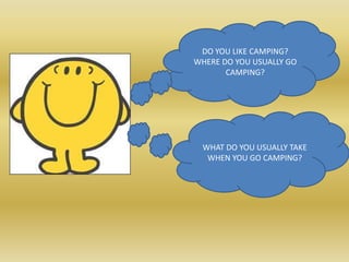 The document provides instructions for an activity where students are split into two groups - one with word cards and one with picture cards. The groups must then find their matching partner from the other group. It then lists various camping and outdoor related words and pictures for students to write down and ask questions about using phrases like "Is there..." or "Are there...". The goal is for students to learn new vocabulary words related to camping and the outdoors through a partner matching and question asking activity.