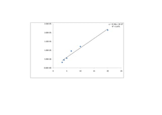 This document contains data from an experiment measuring the magnetic field (B) generated by varying currents (I) running through a conductor. It lists the theoretical and measured B values along with the associated error percentages. Two graphs are shown, with the first graph fitting the data to a linear equation with an R^2 value of 0.975, and the second graph fitting the data to a linear equation with an R^2 value of 1.