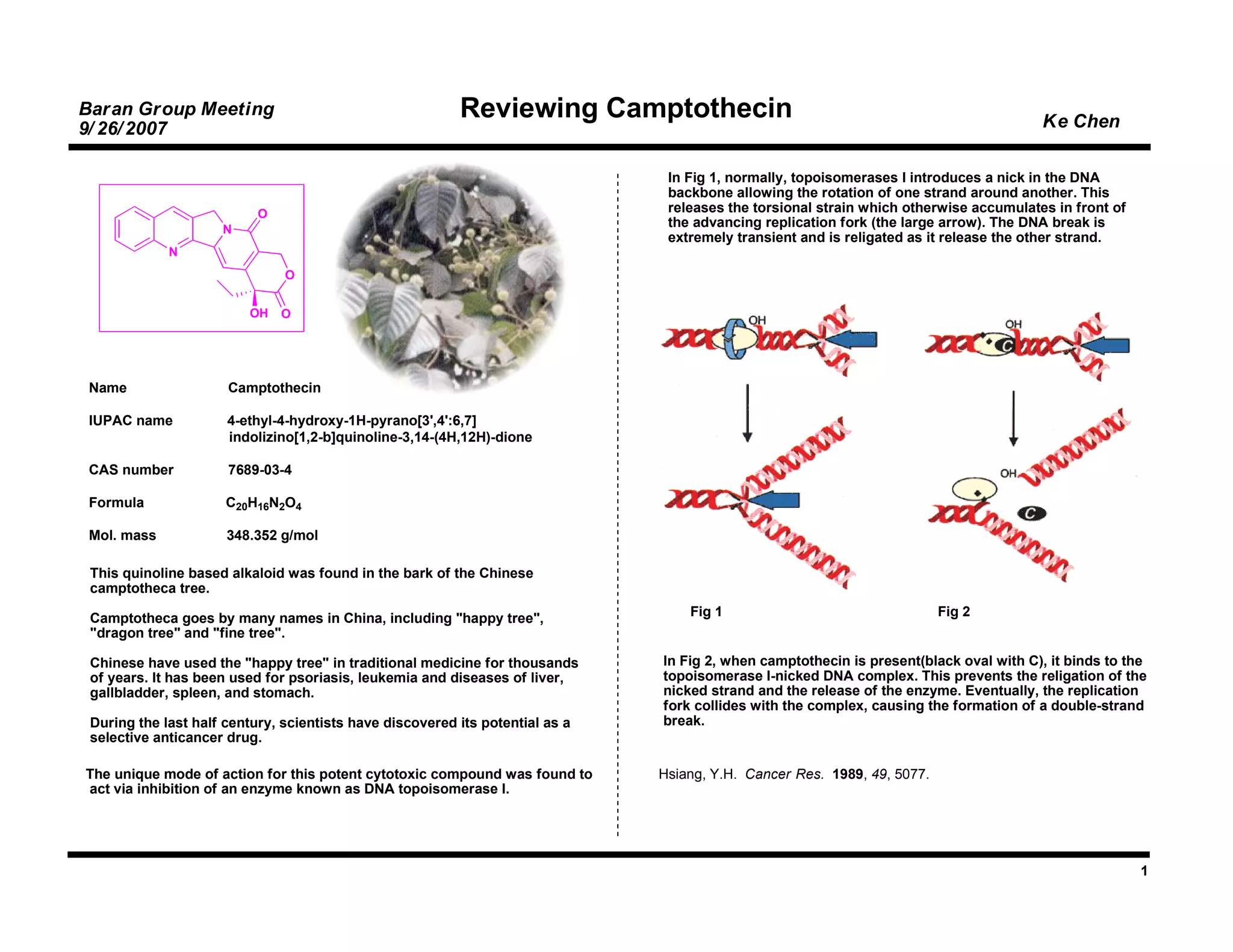 1) Camptothecin is a natural alkaloid isolated from the Chinese camptotheca tree that was found to inhibit the enzyme topoisomerase I.