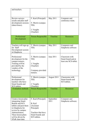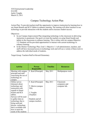 This document outlines a campus technology action plan to provide teacher training on using Smart Boards and tablets to enhance classroom instruction. The plan's objectives are to integrate technology into delivering instruction as outlined in the campus and district technology plans. All teachers will be surveyed about current technology use and needs, and based on the results administrators will schedule professional development sessions for teachers to learn how to use Smart Boards and tablets from vendor trainers. Teachers will then create lesson plans using the new technologies and receive feedback, and ongoing focus groups will allow for peer reviews of integrated lesson plans. The goal is to increase student success through interactive technology use in the classroom.