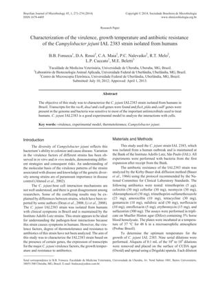The study characterized the Campylobacter jejuni IAL 2383 strain isolated from humans in Brazil. They found that the strain harbored important virulence genes and expressed major virulence factor transcripts. It grew better at 41°C than 37°C, indicating ability to colonize avian hosts. The strain was sensitive to most antibiotics tested and could serve as an experimental model for interactions with host cells and acquisition of antibiotic resistance.