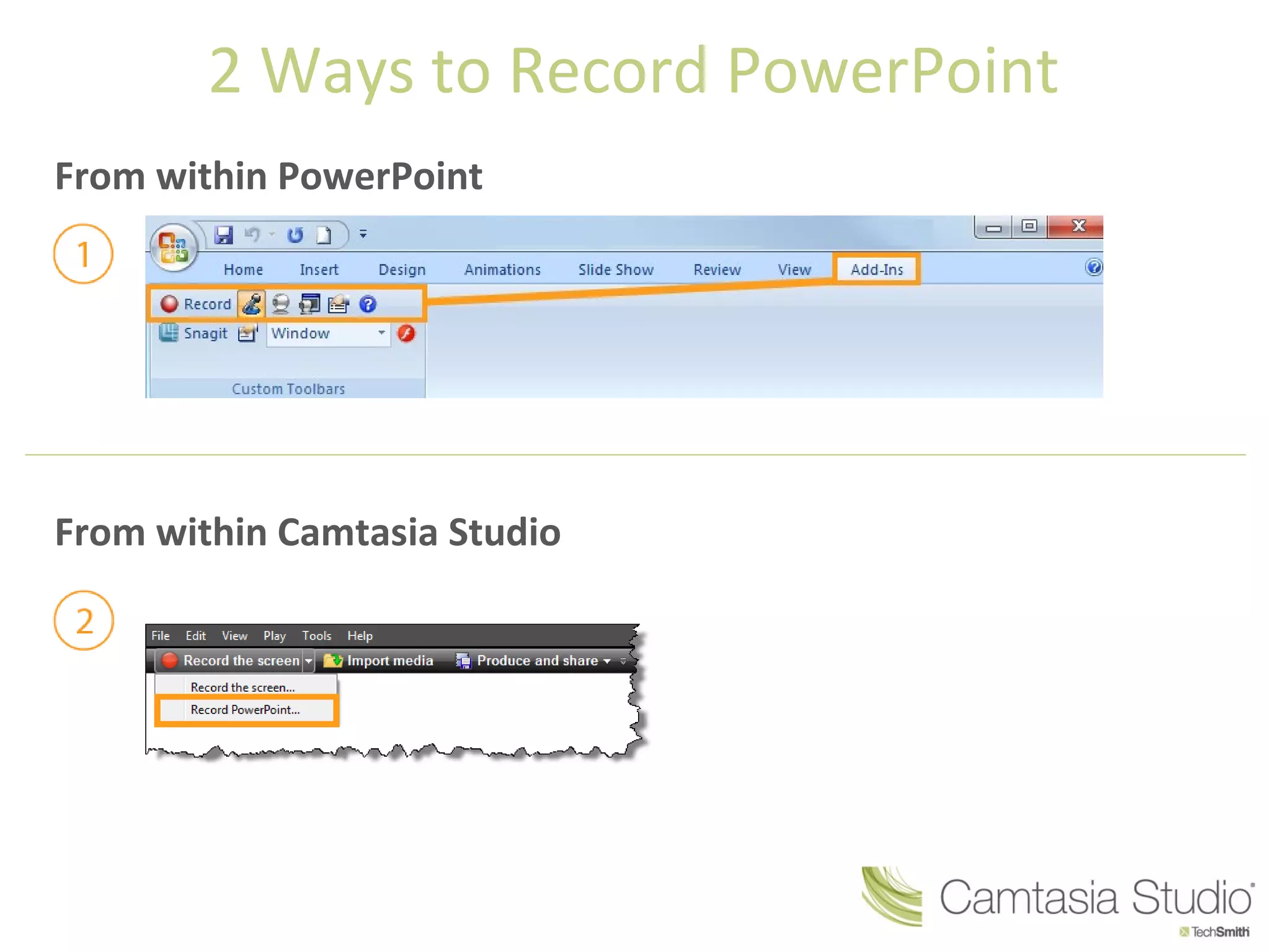 This document describes two ways to record a PowerPoint presentation: from within PowerPoint using the Camtasia Studio recording toolbar, or within Camtasia Studio. It provides instructions for setting up, starting, controlling, stopping, and cancelling a recording. The recording captures audio, video of the presenter from a camera, and mouse cursor movement during the presentation slides.
