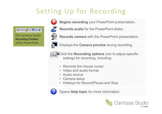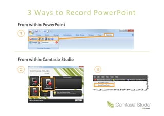 1. From within PowerPoint using the Camtasia Studio recording toolbar which allows recording audio, video from a camera, and mouse cursor directly in PowerPoint.