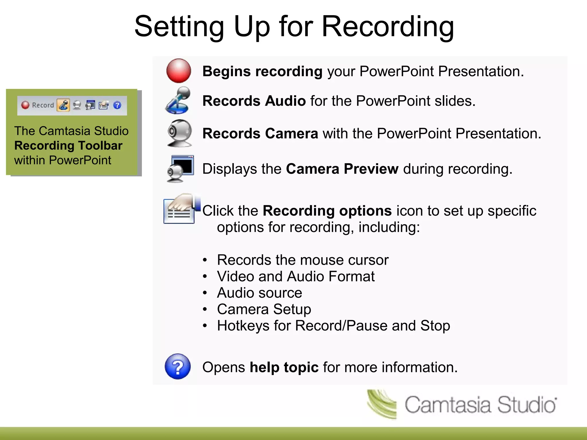 This document outlines 3 ways to record a PowerPoint presentation: from within PowerPoint, from within Camtasia Studio, and setting up the Camtasia Studio recording toolbar within PowerPoint. It describes launching the slideshow, controlling it during recording, stopping the recording, and then either producing or editing the recording file. It also provides instructions for cancelling a recording in progress.
