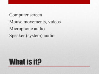 This document provides an overview of Camtasia Relay, a screen recording and video editing software. It discusses what Camtasia Relay is, what is needed to use it, and different ways it can be used, such as flipping the classroom by recording lectures, creating tutorials, annotating student work, and producing digital stories. The workflow for recording, submitting, processing, and sharing videos with Camtasia Relay is also outlined. Various apps that can be used to annotate and record an iPad screen are mentioned.