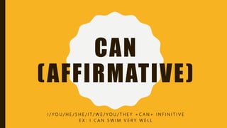 The document discusses the verb "can" which signifies ability or possibility. It can be used affirmatively to indicate ability, negatively to indicate inability, and interrogatively to ask about ability. Examples are provided of using "can" in the affirmative with "I/you/he/she/it/we/they + can + infinitive", in the negative with "I/you/he/she/it/we/they + can't + infinitive", and in the interrogative with "Can + I/you/he/she/it/we/they + infinitive".