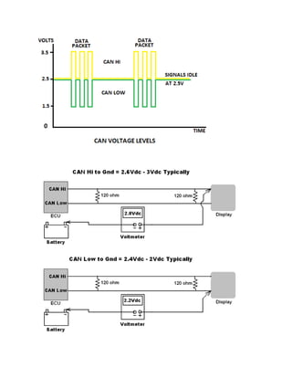 This document provides a troubleshooting guide for CAN bus issues. It discusses proper CAN bus termination, voltage levels, typical failures including missing termination resistors and reversed wiring. The guide outlines steps to check device configuration settings like baud rate and addresses. It describes how to verify network termination resistance and check CAN voltages with only one device powered. The procedure recommends inspecting for reversed wiring if CAN high is not greater than CAN low. Steps are given to check the CAN port of a device if the voltage is low, including measuring pin resistances to identify shorts.