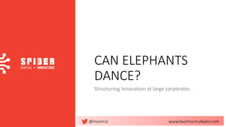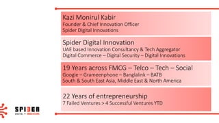 The document profiles Kazi Monirul Kabir, the founder and chief innovation officer of Spider Digital Innovations, a UAE-based innovation consultancy. It discusses how large, established companies often struggle with innovation as they grow in size and discusses three approaches for large corporations to foster innovation: thinking big but starting small and learning quickly from failures; empowering a group of change agents within the company; and making innovation a core part of the organization's culture and strategy.