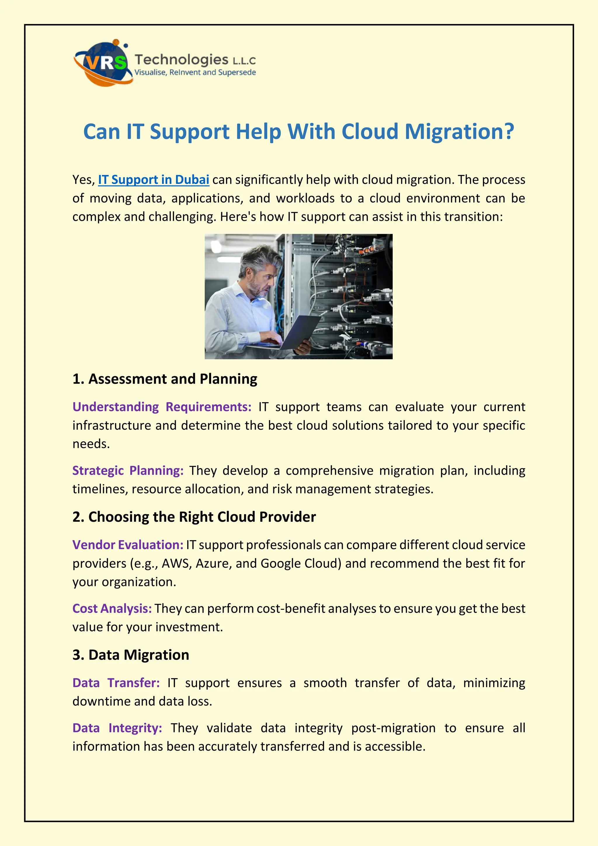 Discover how IT support can streamline your cloud migration, ensuring seamless, secure transitions with expert planning and ongoing support. VRS Technologies LLC offers the most dedicated services of IT Support Dubai. For more info contact us: +971-56-7029840 visit us: https://www.vrstech.com/it-support-dubai.html