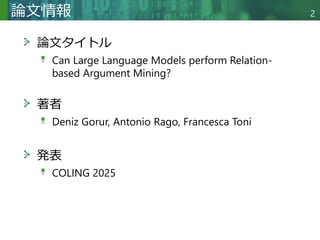 議論抽出(Argument Mining: AM)とは、テキストから議論、その構成要素、および議論と構成要素間の関係を自動的に抽出するプロセスである。オンライン討論をサポートするプラットフォームが増えるにつれ、特に下流タスクを支援する上で、AMの必要性はますます切迫している。関係ベースの議論抽出(Relation-based AM: RbAM)は、議論間の合意(支持)関係と不一致(攻撃)関係を特定することに焦点を当てたAMの一形態である。RbAMは困難な分類課題であり、既存手法は満足のいく性能を発揮できていない。本論文では、適切に事前学習とプロンプティングを施した汎用大規模言語モデル(LLM)が、最良のベースライン(RoBERTaベース)を大幅に上回る性能を発揮し得ることを示す。具体的には、2つのオープンソースLLM(Llama-2とMistral)を用いて10のデータセットで実験を行った。
