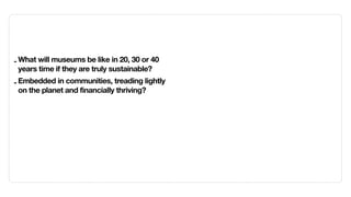 This document discusses whether museums can help save the world by becoming more sustainable in the future. It suggests that in 20-40 years, sustainable museums may be embedded in their communities, have a small environmental impact, and be financially stable. It then provides several scenarios for how California museums could change and adapt, such as becoming more distributed throughout communities, catering to an aging population, or revolutionizing education. The document argues that culture and museums can help create social connections, shift values towards less materialism, and drive innovation to solve world problems and create a happier society.