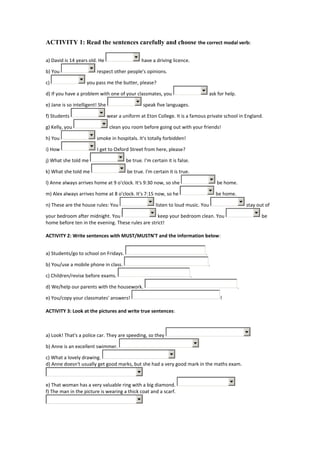 This document provides examples and activities for students to practice using modal verbs such as can, could, may, might, must, shall, should, ought to, and will. The activities include: