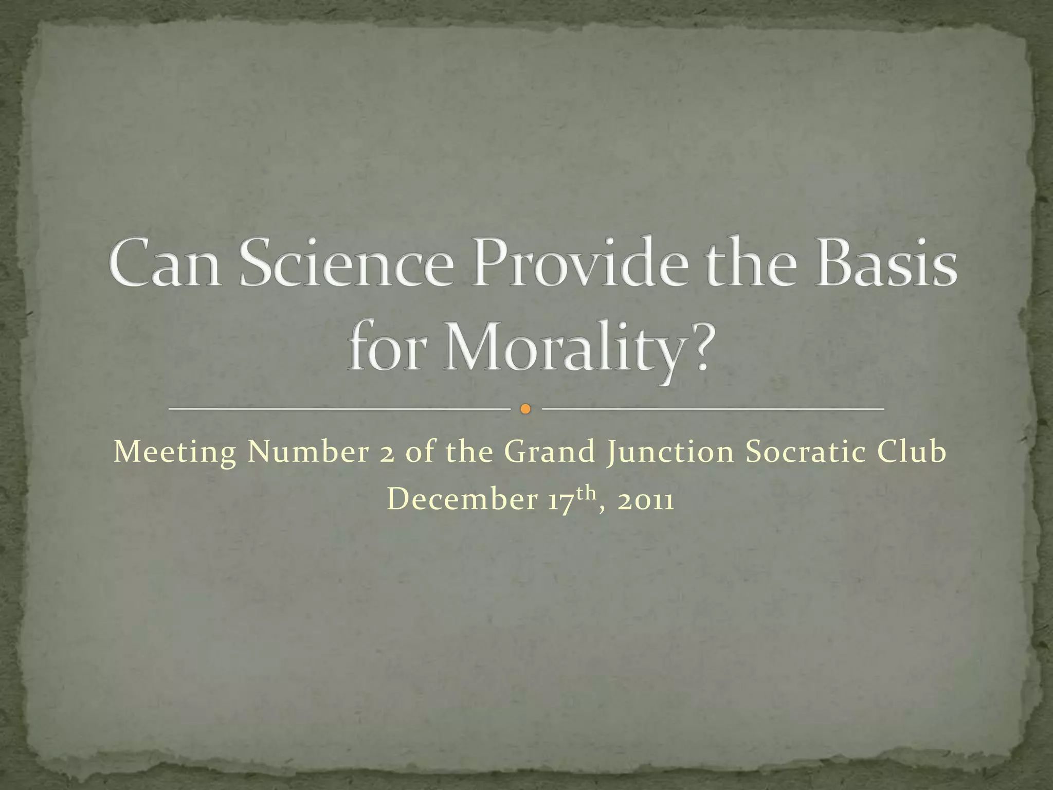 This document summarizes the second meeting of the Grand Junction Socratic Club held on December 17th, 2011. The meeting included a presentation by the author on slides discussing whether morality is transcendental or based on human empiricism. The opposing position was presented via a video of Sam Harris' TED talk arguing science can determine what is right. Questions were raised about defining and measuring concepts like well-being. Examples of applying science to morality, such as treatment of women in Islamic cultures and the Sand Creek Massacre, revealed challenges. The club meets monthly to discuss these types of issues.