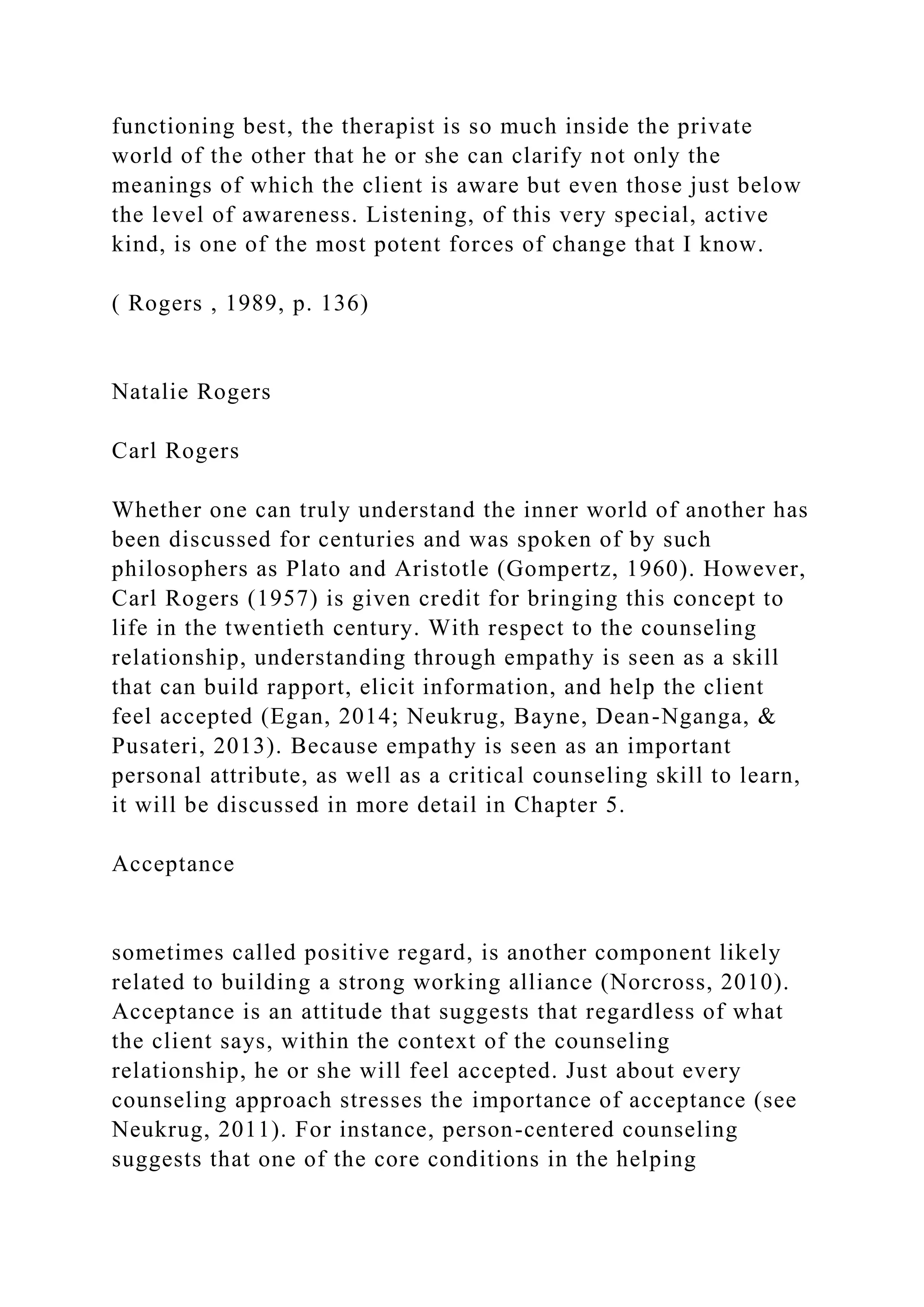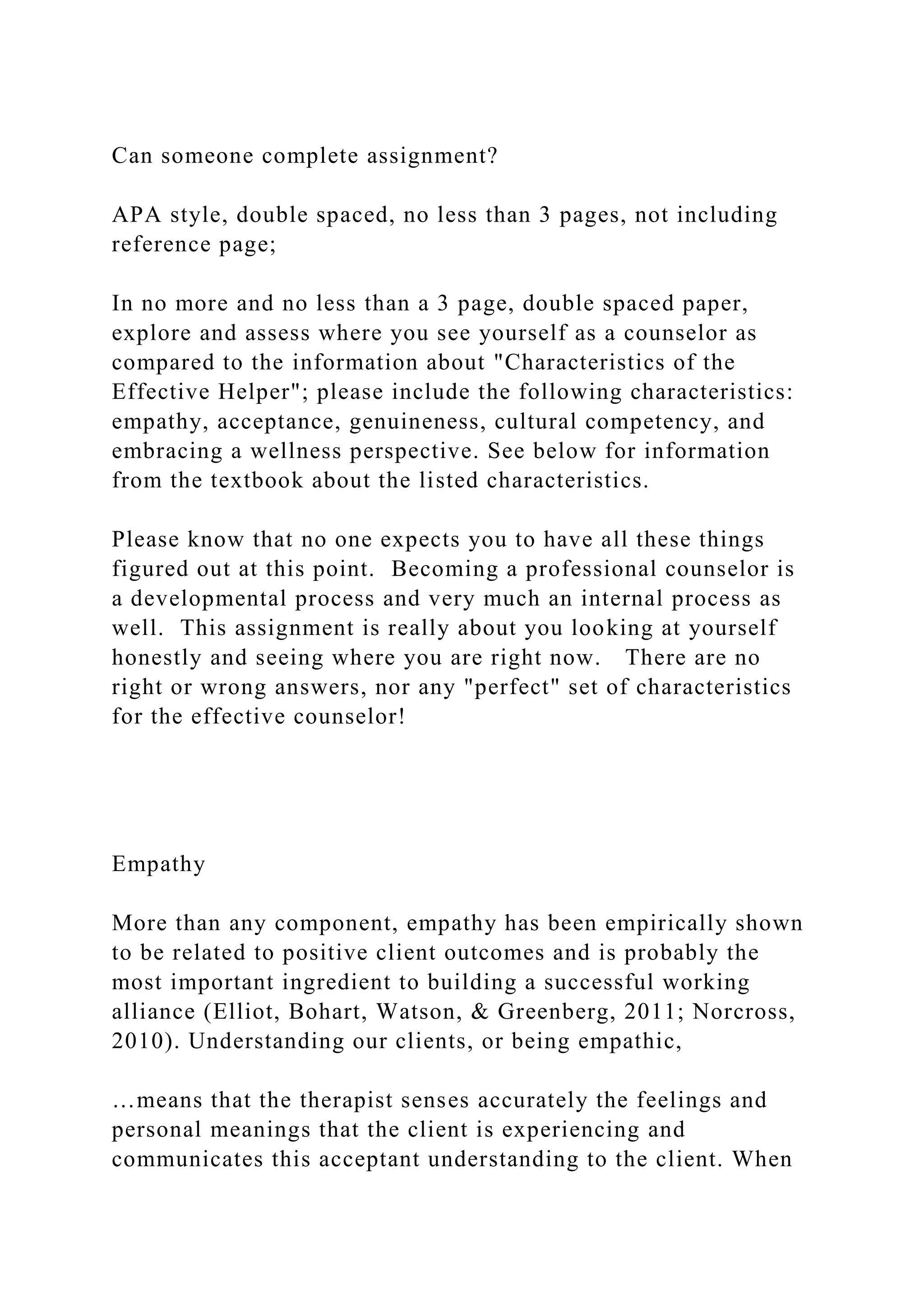 The document outlines an assignment for students to assess their counseling skills in relation to the characteristics of effective helpers such as empathy, acceptance, genuineness, cultural competency, and embracing a wellness perspective. It emphasizes the developmental nature of becoming a counselor and highlights the importance of self-reflection in understanding one's current abilities and challenges. Additionally, it discusses various attributes and models relevant to counseling effectiveness and encourages students to evaluate their wellness and seek counseling experiences for personal growth.