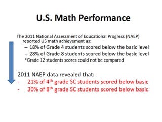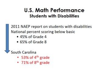 The document discusses various strategies to improve mathematics instruction and support for learners, particularly those at risk, within the framework of the Common Core State Standards. It emphasizes the importance of task analysis, vocabulary instruction, and journaling to develop math skills and concepts, alongside the integration of real-world applications and current events. The document also highlights the need for effective teaching practices guided by data and addresses the challenges faced by students with learning disabilities in math.