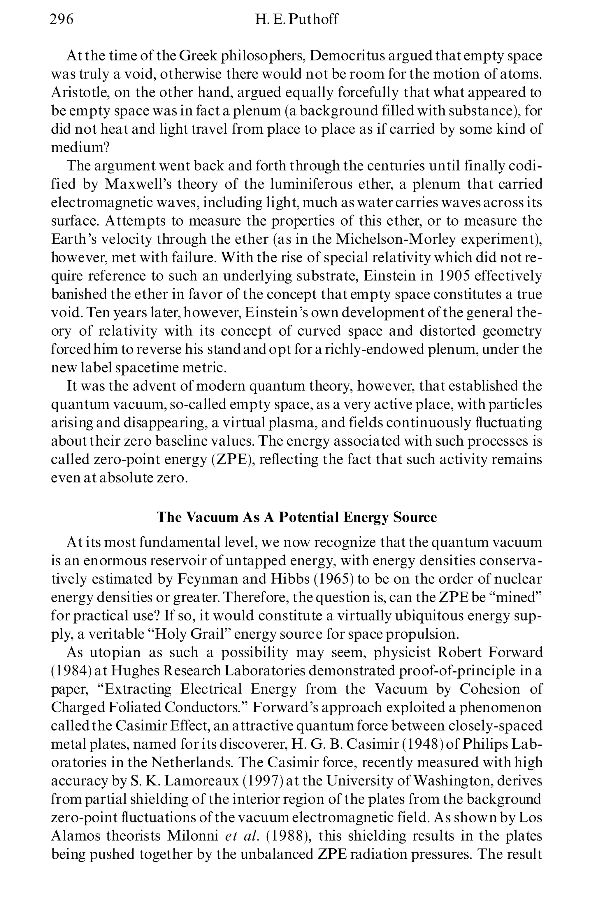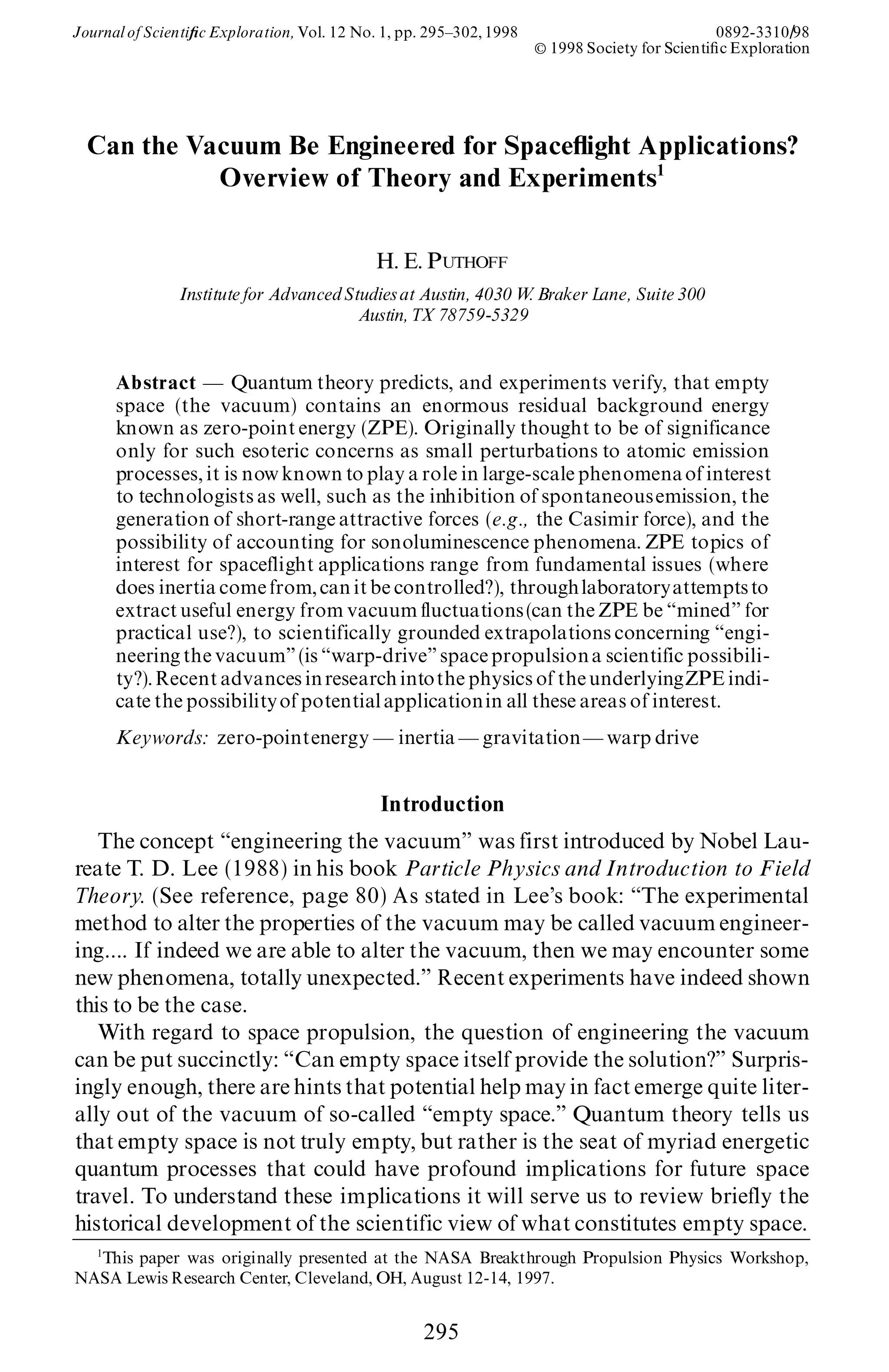 This document discusses the possibility of engineering empty space, known as the vacuum, for applications in spaceflight propulsion. It outlines that quantum theory predicts the vacuum contains residual background energy known as zero-point energy (ZPE). Recent experiments show the ZPE plays a role in large-scale phenomena and could potentially be harnessed. Several approaches are being investigated to extract energy from vacuum fluctuations, including exploiting the Casimir effect, sonoluminescence, resonant dielectric spheres, and micro-cavity techniques. If successful, this could provide a virtually unlimited and ubiquitous energy source for applications like space propulsion.