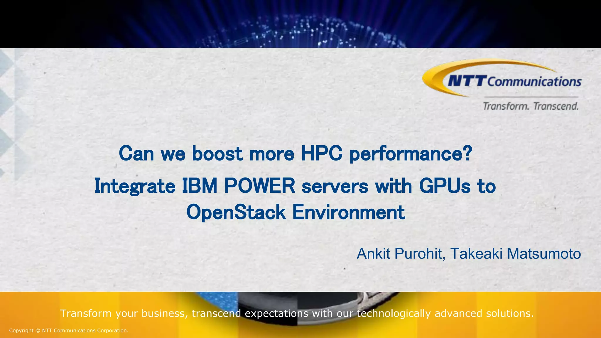 This document outlines the integration of IBM Power servers with GPUs into an OpenStack environment to enhance performance in high-performance computing. It details the motivation, methodology, and benchmark results of using Power8 architecture compared to traditional Intel systems, highlighting significant performance improvements through features like memory interleave. The presentation includes technical specifications and practical steps for implementing this integration in a cloud infrastructure.