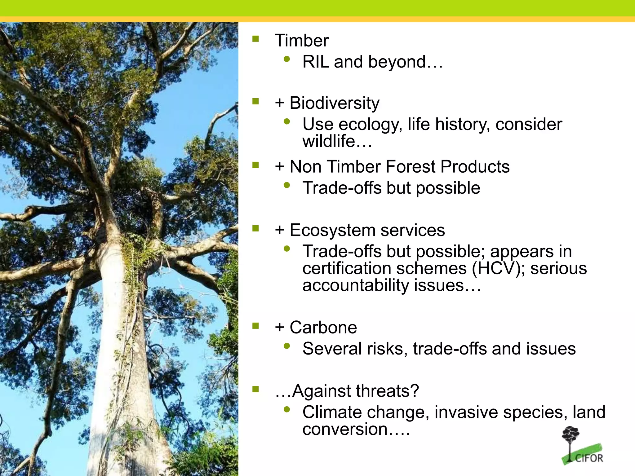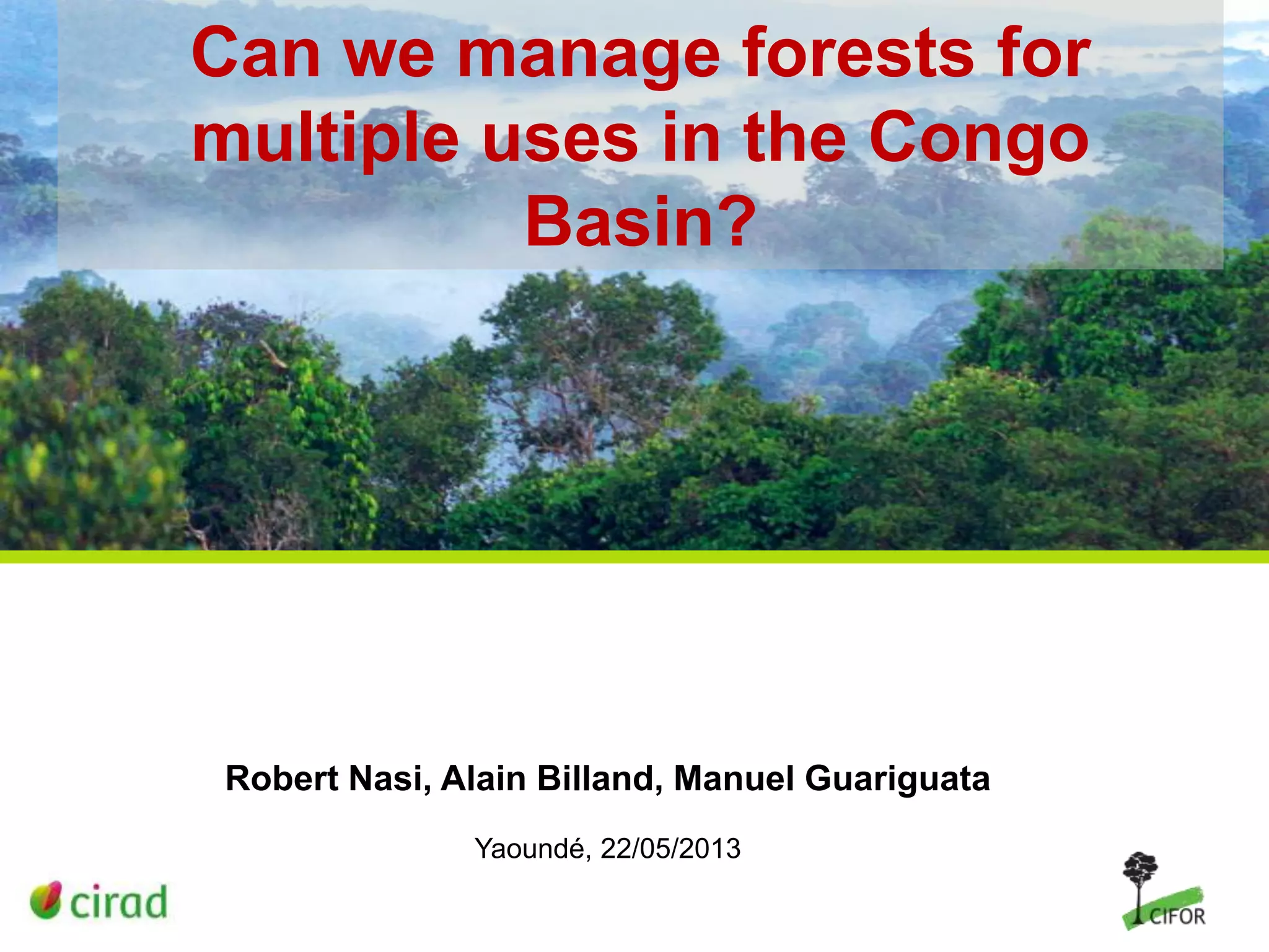 This document discusses managing forests in the Congo Basin for multiple uses. It notes that timber extraction currently dominates management but that forests also provide non-timber forest products, biodiversity, and ecosystem services. Managing forests actively for some combinations of these uses is possible, though there may be tradeoffs. An integrated landscape approach that combines different land use types like protected areas, logging concessions, and community forests may help balance multiple objectives. Research is needed to better understand interactions between different forest uses and how to implement multiple-use management.