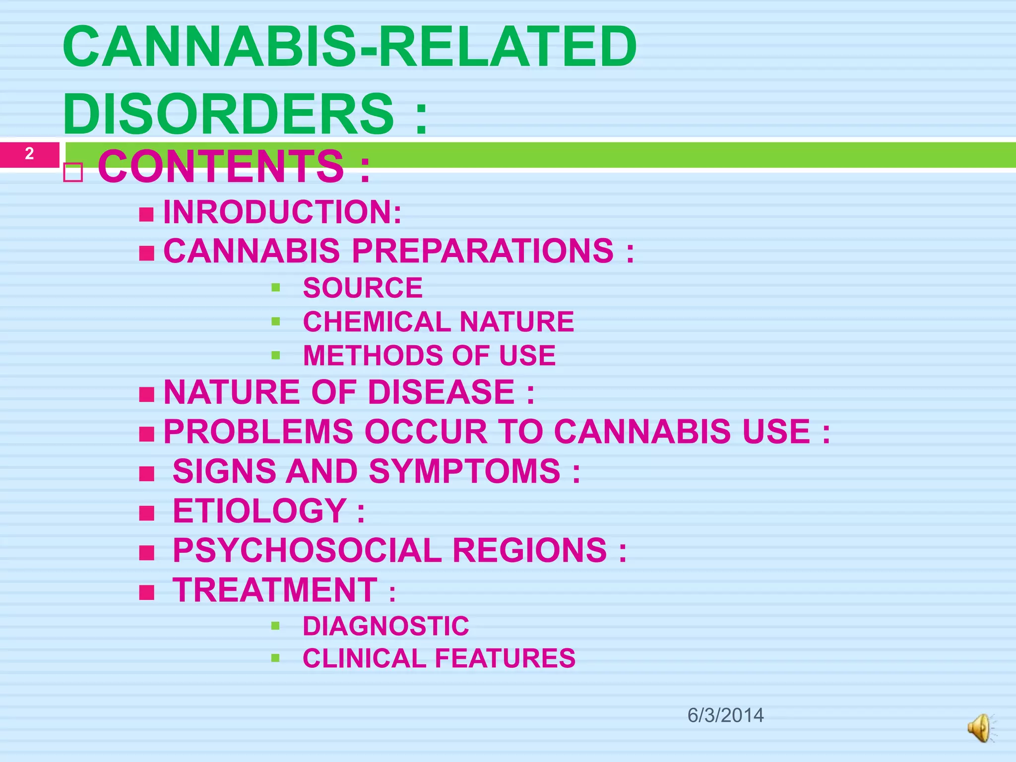 Lokesh Agrawal's document discusses cannabis-related disorders. It covers the introduction to cannabis, its preparations from the Cannabis sativa plant including methods of use. Problems from cannabis use are discussed such as intoxication, anxiety, cognitive impairment, and effects on respiratory, cardiovascular and muscular systems. Signs and symptoms, causes, and psychosocial factors associated with cannabis use disorders are described. The document concludes with sections on diagnosis and clinical features for treating cannabis-related disorders.