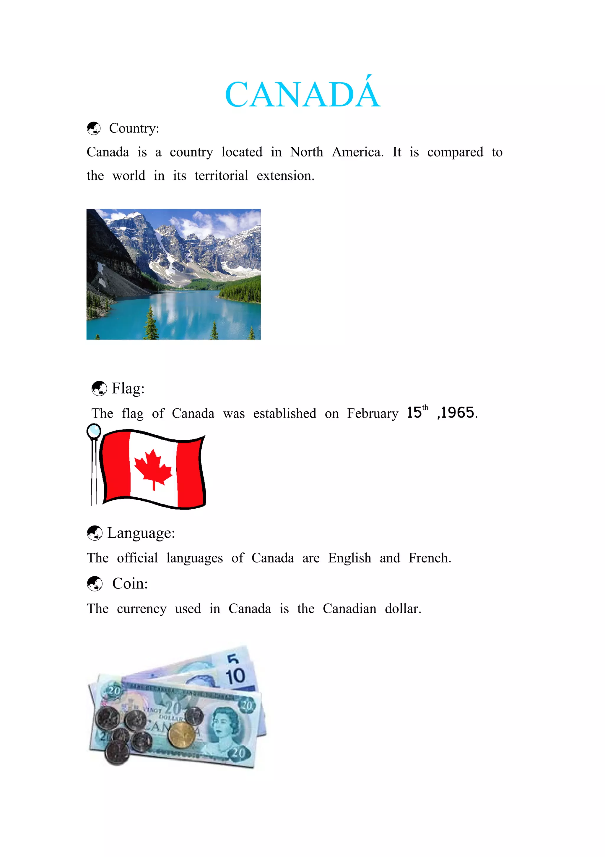 Canada is a large North American country with two official languages of English and French. The Canadian flag was established in 1965 and the currency is the Canadian dollar. Canada has a varied climate and a population of 32 million people spread across its vast territory. The capital is Ottawa, though Toronto is the largest city located in Ontario.