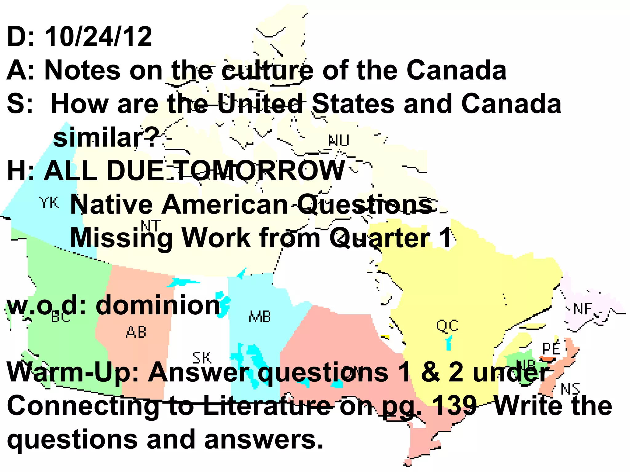 Canada and the United States are similar in that they were both influenced by European and Native American cultures. Canada has a predominantly Christian population and the main languages are English and French. The arts in Canada were influenced by native tribes and focus on landscapes. Education is free and public from ages 5-14/16/18 depending on the province. The majority of Canadians live in Ontario and have a high standard of living with socialized healthcare and a median income of $64,000 for families of four.