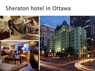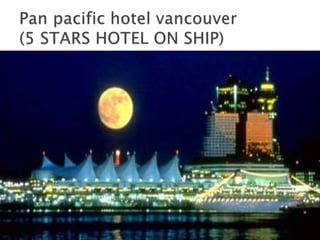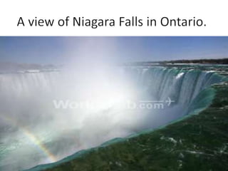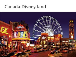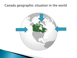 Canada is the second largest country in the world located in North America above the United States. It has a population of around 28 million people and is divided into 10 provinces with its capital in Ottawa. Canada has a diverse population of 43 ethnic groups and is officially bilingual with both English and French being major languages. Tourism is a significant part of Canada's economy, contributing around 2% to its GDP, with cities like Montreal, Vancouver, and Toronto being popular destinations that attract over 1 million visitors annually.