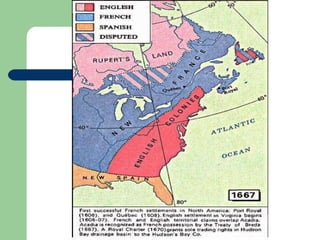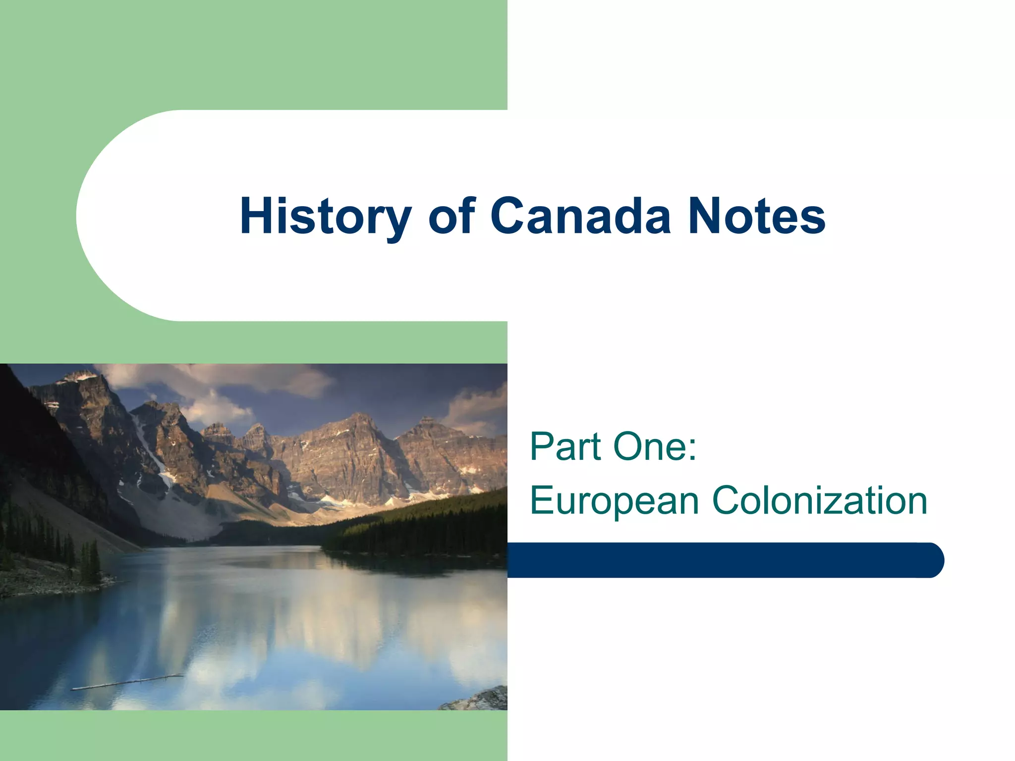 The document provides a summary of the early colonization history of Canada. It describes how the First Nations peoples originally migrated to Canada over 12,000 years ago. It then discusses the early European explorers like the Vikings, John Cabot who claimed land for England, and Jacques Cartier who claimed land for France in the 1500s. France established the colony of New France in 1608 centered in Quebec. Tensions later arose between the British and French for control over Canada, culminating in the French and Indian War in 1754 where Britain gained control over Canada.