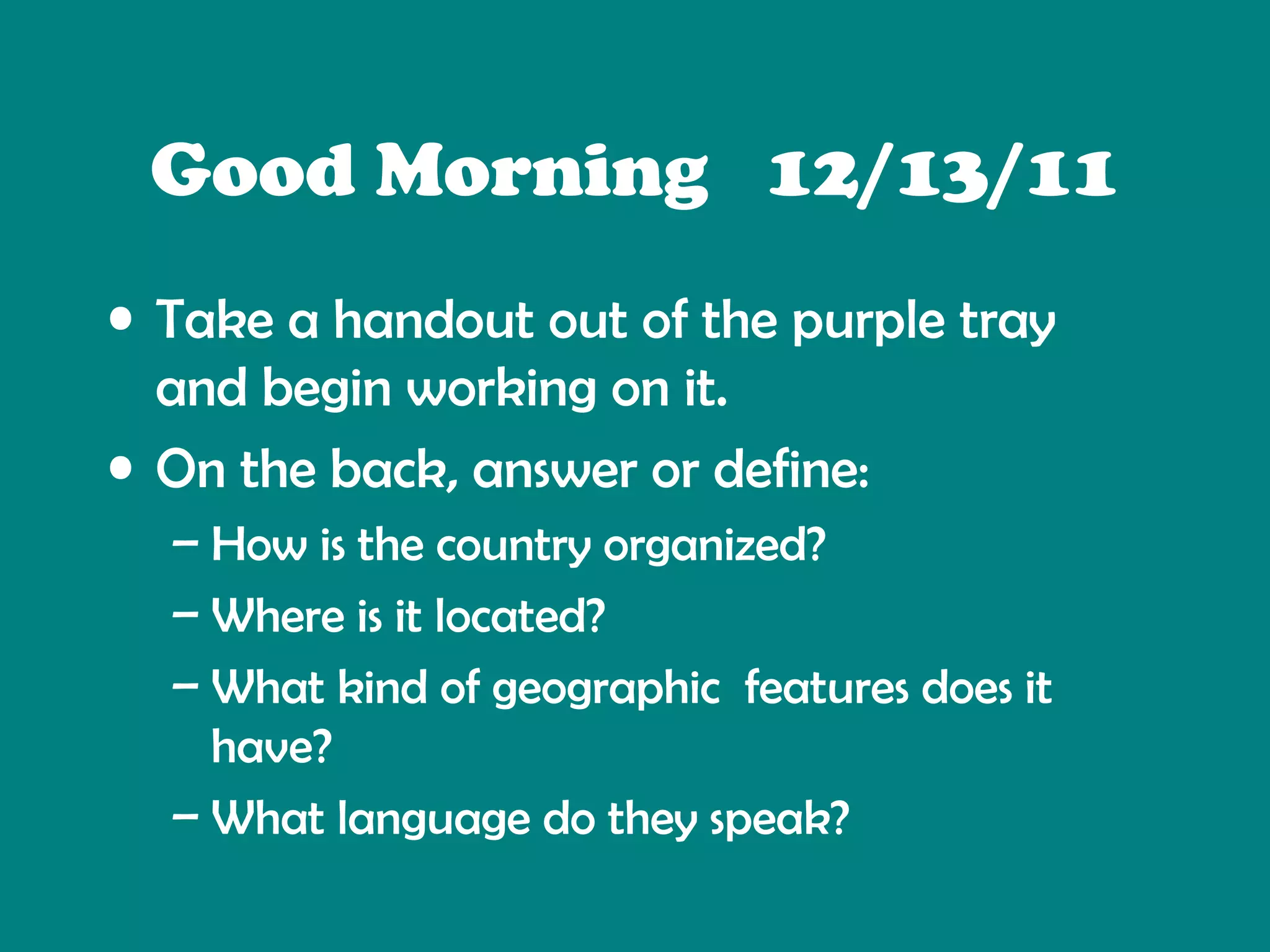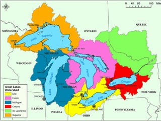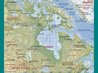 The document provides information about the physical features of Canada. It discusses several key geographic features, including the Great Lakes, St. Lawrence River, Hudson Bay, Atlantic Ocean, Pacific Ocean, Canadian Shield, and Rocky Mountains. For each feature, it provides details about their location in Canada, significance for trade and resources, as well as brief facts. The document concludes with an activity where students choose a physical feature and write from its perspective.