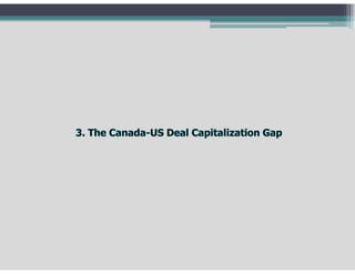 1) Venture capital investment as a percentage of GDP has steadily decreased in Canada since 2000, while it remains over double the rate in the US.