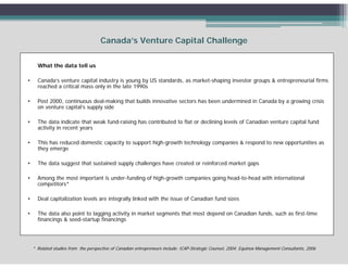 This document analyzes data on Canada's venture capital industry and identifies several challenges it faces: