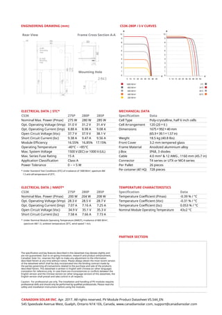 1) The document provides technical specifications for Canadian Solar's CS3K-275|280|285P polycrystalline solar modules, including electrical performance data, mechanical properties, temperature characteristics and certifications.