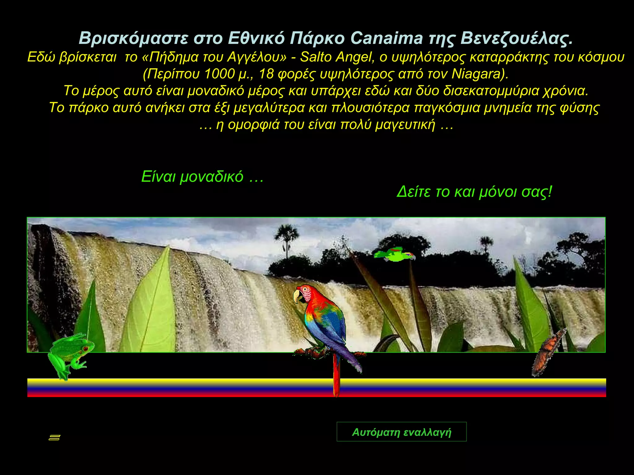 Βρισκόμαστε στο ΕθνικόΠάρκο Canaima της Βενεζουέλας. Εδώ βρίσκεται το «Πήδημα του Αγγέλου» - Salto Angel, ο υψηλότερος καταρράκτης του κόσμου (Περίπου 1000 μ., 18 φορές υψηλότερος από τον Niagara). Το μέρος αυτό είναι μοναδικό μέρος και υπάρχει εδώ και δύο δισεκατομμύρια χρόνια. Το πάρκο αυτό ανήκει στα έξι μεγαλύτερα και πλουσιότερα παγκόσμια μνημεία της φύσης … η ομορφιά του είναι πολύ μαγευτική … Αυτόματη εναλλαγή Δείτε το και μόνοι σας! Είναι μοναδικό …