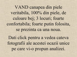 Se vinde o canapea din piele veritabilă, de culoare bej, foarte confortabilă și puțin folosită, la prețul de 250€. Canapeaua este prezentată prin fotografii, iar anunțul include o mențiune amuzantă despre prietena vânzătorului. Aceasta nu este inclusă în prețul de vânzare.