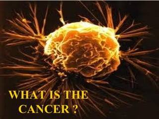 Cancer is a disease characterized by abnormal cell growth that can invade nearby tissues and spread to other parts of the body. Common symptoms include unusual lumps or tumors, bleeding, pain, weight loss, and fatigue. Cancers are primarily caused by environmental and lifestyle factors like tobacco use, poor diet, obesity, infections, and pollution. The most common cancer types are colorectal, skin, stomach, esophageal, prostate, and lung cancers. Prevention strategies include promoting cancer awareness, healthy behaviors, limiting alcohol, vaccination, and early detection programs. Treatment options include surgery, chemotherapy, radiation, clinical trials, and targeted therapies.