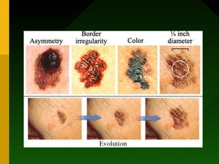 Cancer is caused by uncontrolled cell growth and can spread throughout the body. The main causes are environmental factors like tobacco (25-30% of cancer deaths), diet and obesity (30-35%), infections (15-20%), radiation, and lack of physical activity. Some cancers are also caused by certain chemicals, viruses, and bacteria. The most common cancer types are skin cancer and lung cancer. Symptoms vary depending on the cancer type and location but may include lumps, pain, bleeding, fatigue, and weight loss.