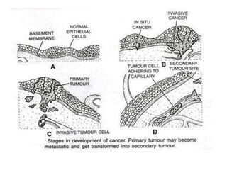 Cancer is characterized by the uncontrolled division and proliferation of cancer cells that invade nearby tissues and can metastasize to distant sites. It can be classified into two main types of tumors: benign, which do not spread, and malignant, which are cancerous and can cause widespread damage. Causes of cancer include genetic factors, exposure to carcinogens, and certain biological agents, with diagnosis and treatment options including surgery, radiation therapy, chemotherapy, and immunotherapy.
