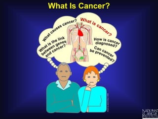Cancer is caused by uncontrolled cell growth. The document discusses what cancer is, different types like carcinomas and sarcomas, how cancers are named by their location, the role of genes in cancer development, and the multi-step process of normal cells becoming cancerous cells that can invade nearby tissues and spread via the bloodstream to other parts of the body (metastasis). Malignant tumors are cancerous, while benign tumors only grow locally and do not metastasize.