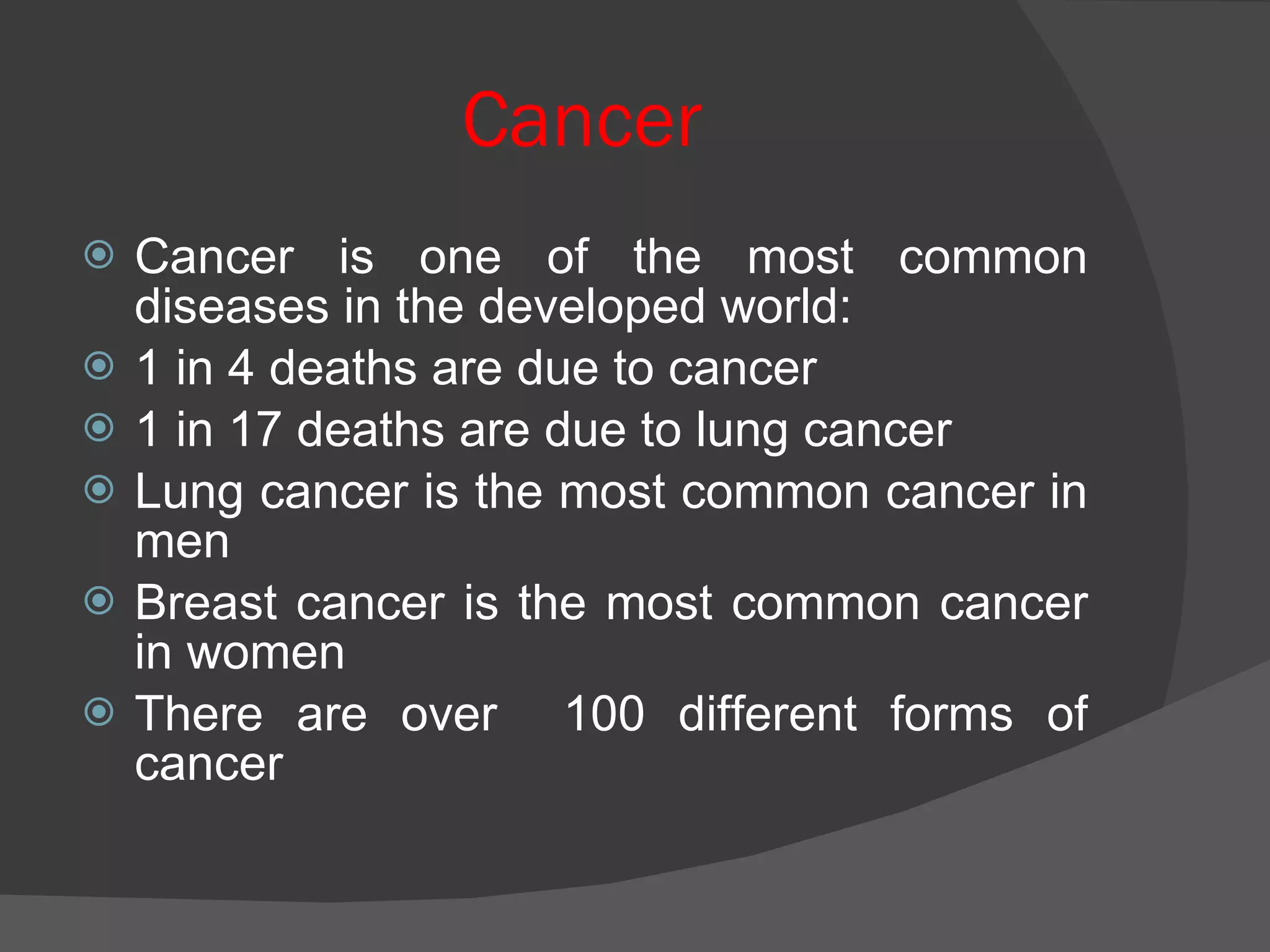 Cancer is one of the leading causes of death worldwide, responsible for about 25% of deaths. There are over 100 types of cancer that can affect people of all ages, with risk increasing with age. Approximately 90-95% of cancer cases are caused by environmental and lifestyle factors like smoking, poor diet, obesity, infections, radiation, and pollution rather than genetics. Cancer occurs when cells divide uncontrollably due to abnormalities in their genetic material. More than 30% of cancers are preventable by avoiding risk factors within one's control such as smoking, diet, exercise, alcohol, and infections.