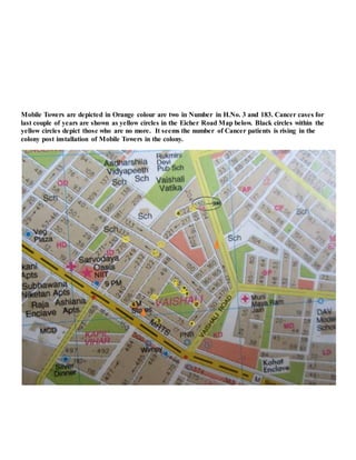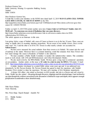 The letter discusses concerns about rising cancer cases in the Vaishali colony in Delhi and their potential link to radiation from nearby cell phone towers. It notes that two towers have been installed in the area. While radiation levels are within government limits, some experts question the reliability of the self-reported compliance levels and recommend independent testing. The letter calls for forming a public health committee to monitor radiation levels and involve local residents. It provides links to research reports on the potential health effects of cell tower radiation.