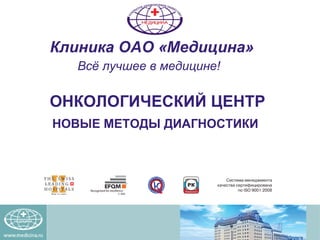 В ОАО 'Медицина' в сентябре 2011 года откроется новый онкологический центр с современными методами диагностики, включающими ПЭТ/КТ, ОФЭКТ и МРТ. ПЭТ/КТ является высокоэффективным методом ранней диагностики онкологических заболеваний, который увеличивает количество выявленных случаев и улучшает прогнозы выживания. ОФЭКТ также предоставляет точную диагностику широкого спектра заболеваний и используется в кардиологии, неврологии и других областях.